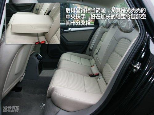 电动座椅调节装置也“很自然”的消失了,还好手动调节拉杆手感不错,可以让人很轻松的就找到舒服的坐姿。后排座椅同样乘坐较为舒适,而且得益于加长后的超长轴距,A4L政府公务版后排的腿部空间非常的奢侈。只是光秃秃的中央扶手让人颇有些不悦,看起来非常的廉价,即使在这里设计一组杯架也会加分不少。