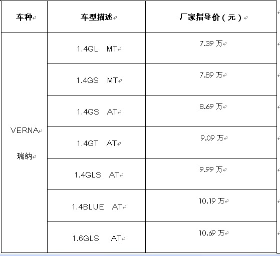VERNA瑞纳是现代汽车集纳全球智慧,为中国消费者量身打造的一款越级而立的A0+车型。秉承现代汽车屡获全球设计大奖的“流体雕塑”设计理念,采用轿跑式的车身设计,宛如引弓待发之箭,动感时尚浑然天成。充满未来感的内饰设计和高度人性化的车内布局,带给驾乘者超越同级的时尚驾乘享受。4340mm*1700mm*1460mm的车身尺寸,造就了同级别车型中最大的2570mm轴距,使其具备了宽敞舒适的内部空间和大容量的行李装载空间,傲视同级别群车。