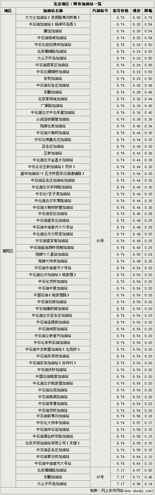 朝阳区是整个市区里面出现降价加油站最多的区域,共有超过50家的加油站出现的不同程度的降价动作,93号汽油最高优惠幅度有0.74元每升。同时朝阳区可以看出,加油站越靠近城区,价格优惠的幅度就越小。区域内共有三家加油站97号汽油价格出现波动,价格全数低于7元。