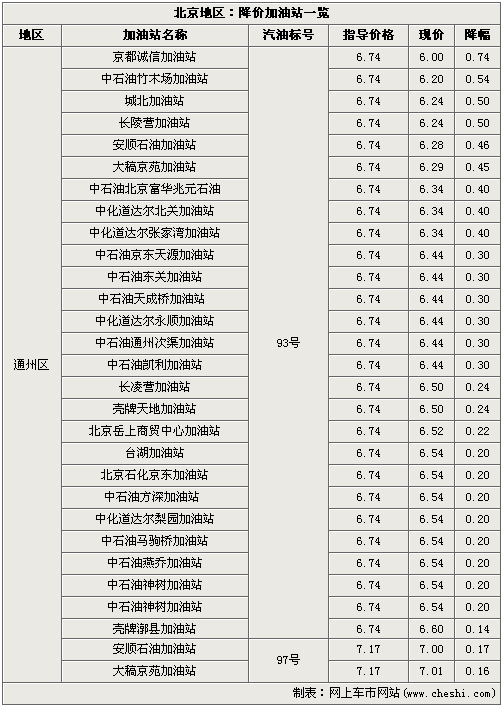 通州区也拥有20以上的降价加油站,93号汽油最高的降价幅度达到了0.74元每公升,降价0.3元以上的加油站超过半数。此区域内有两家加油站97号汽油出现降价,最高降价幅度有0.17元。