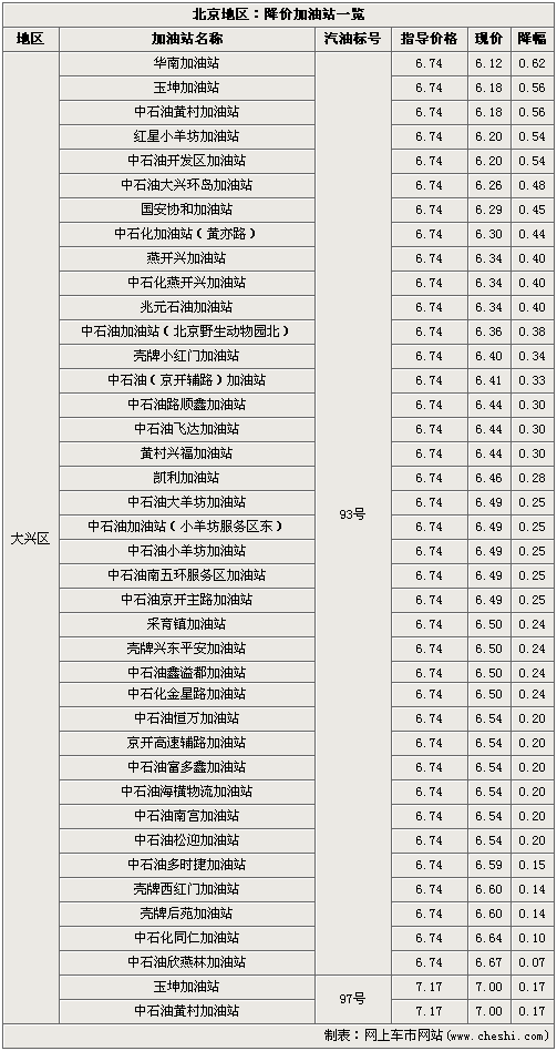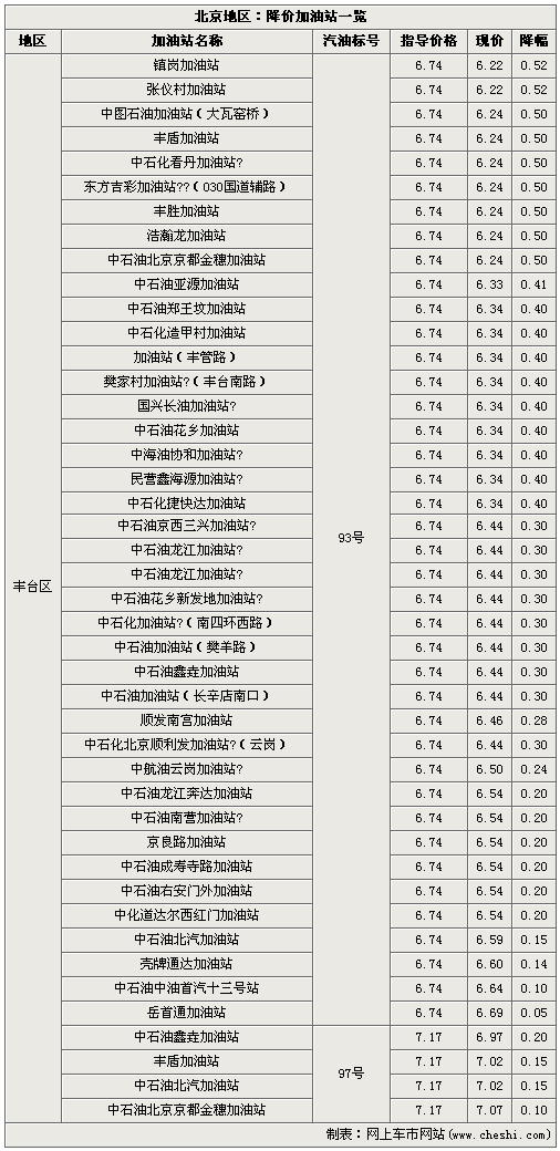 相距不远的丰台区情况又是如何呢?丰台区共有30多家加油站出现降价情况,93号汽油最高降幅为0.52元每升,降幅高于0.3元每升的加油站超过半数。共有4家加油站97号汽油出现了降价情况,降幅又0.2-0.1元不等。