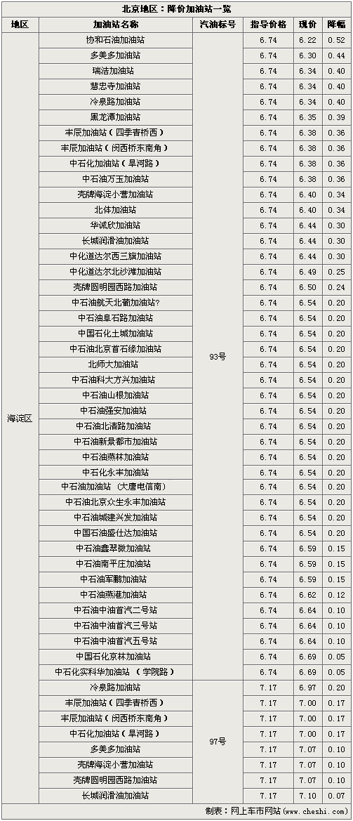 海淀区是降价加油站数量仅次于朝阳区第二名,共有超过40家加油站出现了降价的动作,93号汽油最高降幅达到了0.52元每升,但降幅在0.3元每升以上的加油站仅有三分之一。不过在海淀区97号汽油共有8家加油站给出了降价,平均降幅都不高,取胜在于数量。