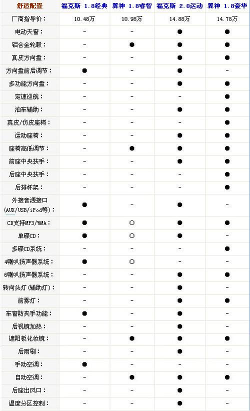 在入门车型的舒适性配置方面,两车都表现的不尽如人意。福克斯经典版的钢轮毂让人郁闷,座椅高低调节和遮阳板化妆镜也都是非常必要的配置。相比起来翼神的主要缺憾是没有外接音源接口,这不得不说是一个配置上的缺陷。