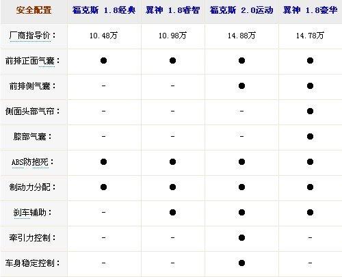 在安全配置方面,两车的入门版车型基本保持在同一水平,正副驾驶双安全气囊和ABS+EBD也是目前主流的入门车型安全配置。而在较高配车型上,福克斯在主动安全上有一定优势,其运动版车型拥有牵引力控制和电子稳定程序。翼神则在被动安全性上出色一些,侧面头部气帘仅出现在福克斯三厢豪华型上,而全系标配的膝部气囊在福克斯的全系都没有配备。