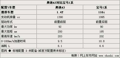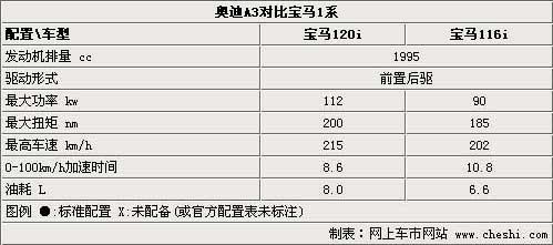 与奥迪刚刚在国内投放的1.4T引擎的A3相比,宝马116的发动机动力方面与1.4T的奥迪A3基本相当。两款车型的各项技术参数例如加速时间、油耗表现也处于相近的水平上,可以说BMW 116i恰好可以在价位以及动力上满足消费者的需求。目前奥迪A3 1.4T入门车型的价格是26.8万元,如果未来BMW 116i的官方定价与我们的预测接近,那么25万元左右的价格加上2.0升排量和后轮驱动,绝对称得上是奥迪A3的劲敌。