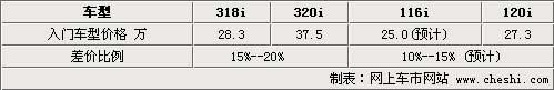 其实BMW针对相同引擎进行功率扭矩的不同调教也是有先例的,目前国内销售的318i和320i就属于相同引擎排量的不同动力调教,巧合的是这两款3系所使用的也是1系120i的这款4缸自然进气引擎。从价位上来说3系的318i和320i之间的定价差距在15%--20%左右,那么未来BMW若引进1系的116i车款,其官方定价同样会比现在的120i更低。根据BMW 针对318i和320i的定价差异,116i与120i的定价差距大致会在10%--15%之间,也就是25万元左右。