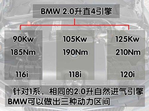 在欧洲市场BMW旗下的1系轿车在2.0升排量这个级别内,拥有3款细分车型,分别是116、118和120。而其他排量的车型还包括130以及120的柴油车款,目前中国市场所销售的1系为120和130两个款式。很难想象一款2.0升级别的自然进气引擎被BMW弄出了那么多种“花样”,在欧洲市场就有从90千瓦/185牛米、105千瓦/190牛米到125千瓦210牛米的3种车款。其中90千瓦/185牛米的入门车款被命名为116i属于BMW 1系当中价位最低的车款。