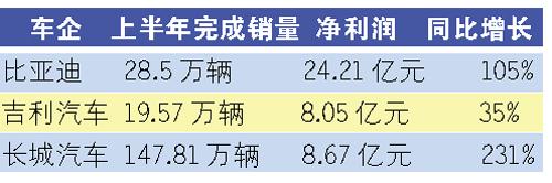受益于上半年车市的产销两旺,三大车企的业绩全线飘红,其中长城汽车取代比亚迪成为业绩增长最迅速的民营车企,吉利汽车忙于整合沃尔沃轿车业务,暂时没有突出表现。
