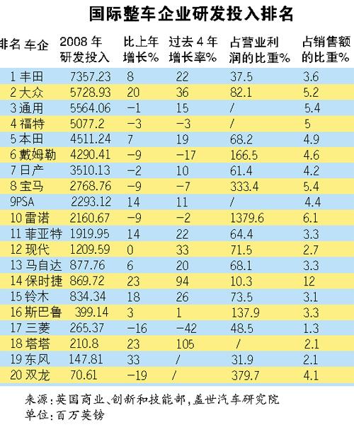 研发能力是汽车企业的核心竞争力。在全球车企中,谁最舍得投入?日前,英国商业、创新和技能部新近公布的2009年(以2008年财务数据为基础)全球企业研发投入前1000强,其中有20家汽车整车企业,49家汽车零部件(含轮胎)企业上榜,投入最多的是丰田,唯一上榜的中国汽车企业是东风汽车公司。