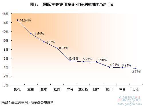 德国车企中,宝马的盈利水平最高,其次为戴姆勒,大众最低。大众在图1所示的净利率前十车企中排在最末位,但其净利率(3.77%)高于另外两家以生产小型车著名的企业铃木和菲亚特,二者的净利率分别只有2.32%和0.61%。