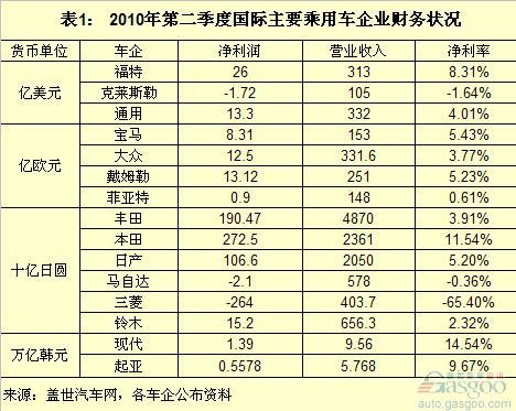 2010年第二季度国际主要乘用车企业大部分扭亏为盈,但是克莱斯勒、马自达、三菱仍有不同程度的净亏损,不过其亏损程度均已减轻。部分企业已实现营业利润为正,如克莱斯勒第二季度实现1.83亿美元的营业利润。三菱的亏损虽已收窄,但其4037亿日圆的营业收入中净亏损2640亿日圆,在国际乘用车企中属财务状况最糟糕的。