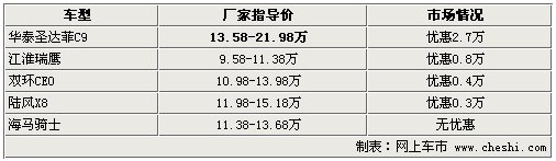在五款自主品牌SUV中除了上市时间不长的海马骑士外,其他4款车型均有不同程度的优惠。其中华泰圣达菲2.7L版本车型出现了2.7万的最高优惠,其他三款车的优惠程度一般。