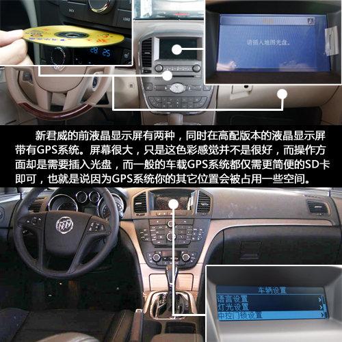 新君威的高配版本配备GPS导航系统,同时在中央控制台有个彩色液晶显示屏,不过个人感觉新君威的这个显示屏的色彩感觉并不好,不像是20几万的中型轿车所应该使用的。