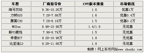 通过以上表格,我们可以清楚的看出,7款车当中,除了上市时间比较久的海马欢动和力帆620以外,其他几款车型都仅有小幅度降价或不降价。由于几款车型刚刚上市不久,所以我们对它们价格优惠的期望也并不大。