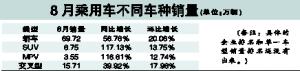受国家鼓励政策影响,节能车销售大幅上涨,132款节能汽车产品8月销量为1296万辆,较7月份增长32.04%,明显高于轿车的总体增长水平。8月份,1.6L及以下排量轿车销售4807万辆,环比增长21.08%,同比增长60.56%,占轿车销售总量的68.94%,占比较7月份增加1.03个百分点。