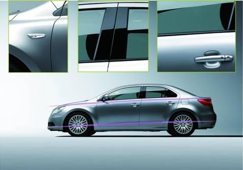 从前大灯贯穿至尾灯的笔直腰线、车门下方的折线及镀铬装饰条,再次凸显了Kizashi凯泽西的运动特性,即便优雅伫立,也好似迅猛向前。