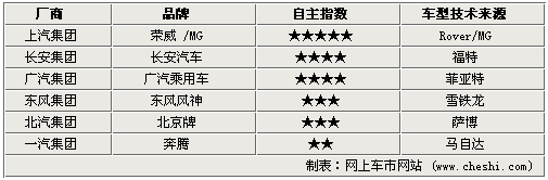 从上表可以看出,坐拥大众和通用两个合资品牌的上汽,无疑是自主之路走得最好的,在买断ROVER先期打造了荣威750、550等车型,而后续推出的则是全新技术的车款比如350。而广汽作为新的加入者,近日下线了传祺新车,虽然新车源自菲亚特旗下的阿尔法罗密欧,但还是进行了不少改进,并没有完全照搬过来。而获得两星的一汽集团,其奔腾系列车型B50、B70依然是来源马自达6,经过了这么年的发展,仅仅是换个外观就宣称自主研发是很难让人接受的,一汽集团还需努力捍卫老大的地位。