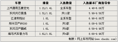此次入选的6款车型分别来此日系合资品牌和自主品牌,并非全是自主品牌独当一面,可以看出国际品牌对于这块市场的重视程度有所提升。车型售价最低的是刚刚上市不久的上汽通用五菱荣光,4-6万的价格让它拥有颇高关注度;郑州日产NV200也是一款重量级车型,郑州日产品牌以轿车底盘推出的MPV车型,CDV的全新概念给这个领域带来了新感觉。