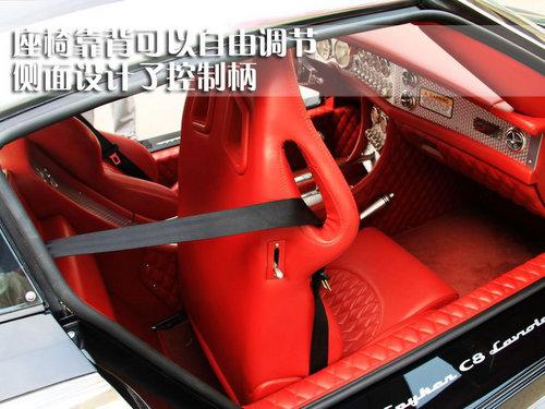 世爵C8 Laviolette采用的是红色真皮材质座椅,筒式的设计运动感非常强烈,靠背对身体的包裹性也非常到位。这款超级跑车采用的是一体式头枕,上面还印有世爵的经典车图案。当然,世爵C8 Laviolette仅有的两个座椅,靠背都可以通过侧面的控制杆前后调节,不过因为后排是发动机舱,副驾驶靠背不能放倒,这样的功能真正意义不大。