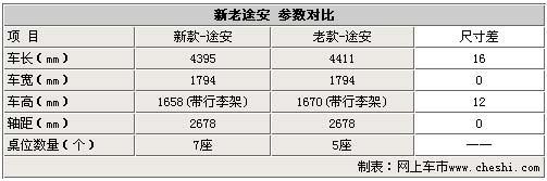 上海大众即将批量生产的小改款途安在车身尺寸上与国外已经上市销售的车型基本一致,与现款车型相比几乎没有变化。小改款途安仍旧来自大众的PQ35平台,与老款车型相比在长度方面增加了1.6厘米,宽度、轴距不变,高度仅增加了12毫米。以前2.0L车型没有第三排座椅,为标准5座。小改款的途安将第三排座椅标配,成为了标准的7座MPV车型。