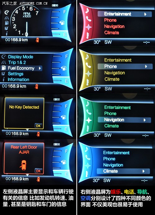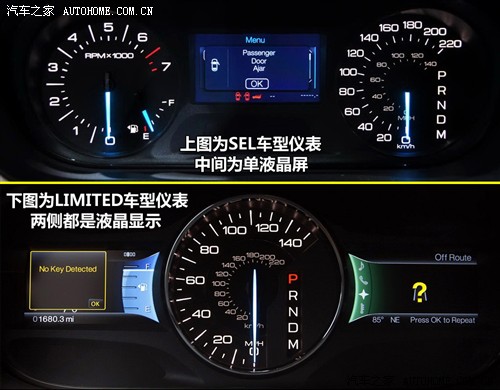 锐界内饰的用料给人留下了很深的印象,中控台上部全部由软性材料覆盖,整体的做工也完全超过了国产福特车型的水平,十分精细。而高低配车型最大的不同就在于仪表盘的样式和功能。高配车型的双液晶显示不仅时尚,也让驾驶者可以手不离开方向盘完成更多操作,间接增加了安全性。下面就让我来分别介绍两块液晶平的作用。