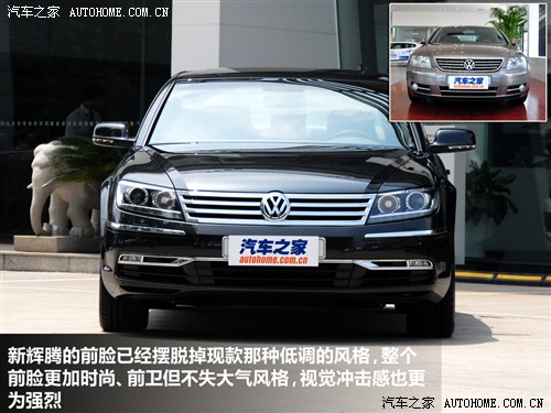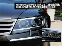 经过大改款的新辉腾拥有全新设计的外观,尤其是在前脸方面,镀铬散热格栅更显挺立,两旁的车头灯组与格栅形成一个整体,过渡得很自然,其中氙气大灯和LED日间行车灯为全系标准配置。保险杠也经过了全新的设计,其下方的雾灯由圆形变成了条状设计,并且利用了LED技术,配上周围的镀铬装饰,为前脸增加了动感元素。
