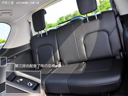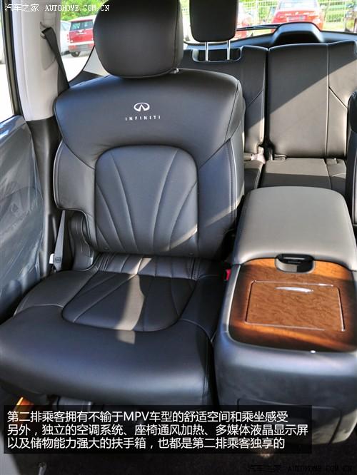 2011款英菲尼迪QX56的车身尺寸十分夸张,车长5290mm宽2030mm高1935mm,轴距达到3075mm,所以空间和舒适性绝对不是问题。即使是第二排乘客也拥有极高的乘坐感受,独立空调、座椅通风、中央扶手箱都是后排独享的配置。