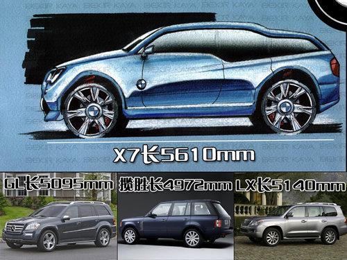 我们目前所获得的X7的图片仅仅是宝马官方草图和假象图,不过这对于车型的未来展望已经足够了。宝马X7将会基于成熟的X5平台并且做一定修改,车身尺寸方面会比X5长760mm左右,那就是达到了惊人的5610mm。要知道目前最新款的奔驰GL550的车长不过才5095mm,宝马X7全面超越奔驰GL级算得上是真正意义上的全尺寸SUV。