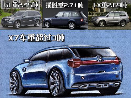 宝马X7预计车重将超过3吨,同等级的竞争对手奔驰GL550整备质量仅为2.5吨不到。如此看来GL级在宝马X7面前也算是小弟了。据称宝马X7会融合X5和7系的多项设计元素,将X5的高性能越野能力和7系的豪华装备完美结合。X7内部空间会设置三排座椅,保证所有乘客都拥有极好的舒适性,而不是市面上一些SUV所谓的“假三排”。它的行李厢也是一大亮点,容积可能达到3000升左右,奔驰GL550的这一数据是2300升。