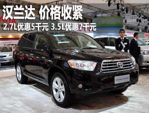 广汽丰田生产的汉兰达Highlander于2009年5月25日正式下线,拥有2.7L和3.5L两个排量共10款车型,价格区间为24.88~42.98万元。近期,编辑从北京广汽丰田4S专营店获悉,汉兰达现车充足,优惠幅度有所缩水,现金让利最高7千元。详情见下表: