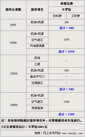 从上表中可以看到,卡罗拉不提供免费的首次保养,更换机油以及机滤,价格为340元,保养周期为5000公里。最在第四次的保养时,卡罗拉除了更换机油与机滤以外,还更换空气滤芯以及变速箱油,保养费用也相对高了一些,为1305元。2为万公里卡罗拉保养总花费为:3061元。