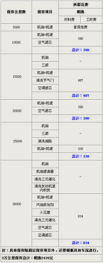 在30000公里的时候,车型进行第一次大保养,价格相对稍贵。后期的保养朗逸项目比较常规,3万公里保养总计为2439元。