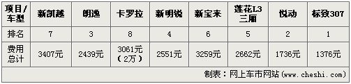 通过汇总可以看出,8款车型中保养费用在2000元以内的有伊兰特悦动、标致307两款车型,属于前段班。2000元-3000元阶段的有大众朗逸、斯柯达新明锐和莲花L3三厢等三款,前两款同为大众集团车型,保养费用相差无几,作为国产不久的莲花L3保养花费拥有这样的表现值得鼓励。3000元以上阶段的有大众新宝来、通用别克新凯越和丰田卡罗拉,花费金额总体较高,其中丰田卡罗拉垫底的表现让人大跌眼镜,希望以后再后期使用方面可以有所改进。