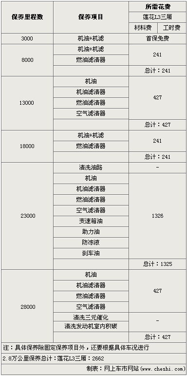 莲花L3三厢首保的时间为3000公里,短得令人费解。首保免费,从第二次保养开始收取费用。在小保养和中期保养两个部分,莲花L3三厢分别为241元和427元,而在23500公里的大保期时,莲花L3三厢保养项目较多,价格为1325元。保养费用总计为2662元。