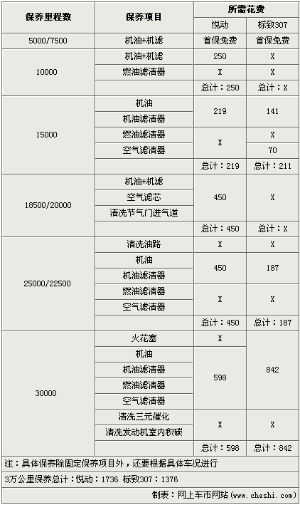 从表中我们不难发现,标致307由于7500公里较长的保养周期的原因,第二次和第四四次保养都没与悦动同步,而在表中后段部分两者并入一起,它保养总价是相对比较低。总体看来两款车型的保养项目各有不同,。3万公里保养总价伊兰特悦动表现中规中矩,保养价格为1736元;标致307表现抢眼,总计为1376元。
