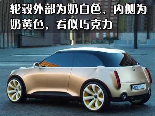 MINI Core概念车采用内凹陷七幅白色轮毂,内侧喷涂的是奶黄色,造型非常可爱就如由巧克力制成一样。