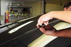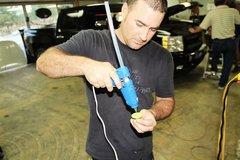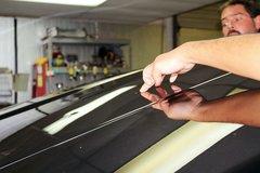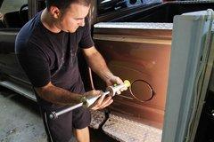 车身较大的凹陷部位,也可以通过微钣金修复。首先将涂抹强力胶的塑料件粘贴在划痕凹陷处的两端,然后通过外力将凹陷处拉出。由两边依次向凹陷中部反复拉出,直至修复完整。
