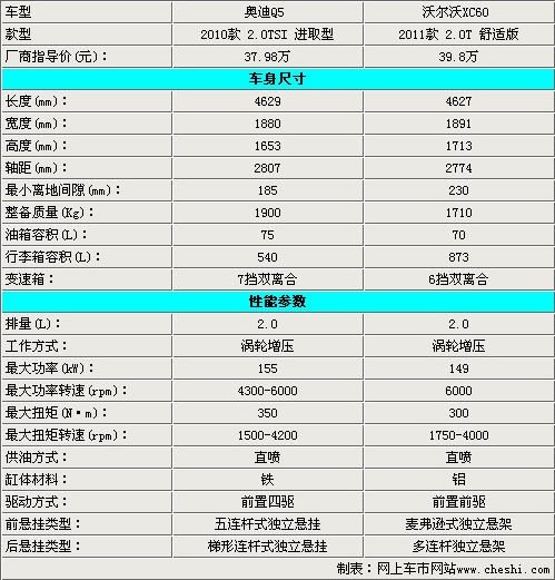 两款车在车身尺寸上的差异并不很大,轴距方面也仅有20多mm的差距。而在动力方面,奥迪Q5可以为使用者提供155KW的最大功率和350Nm的最大扭矩输出,这一项要比XC60 149/300的表现要强出不少。另外,奥迪Q5全系车型均采用奥迪家族传统4驱技术quattro,而XC60最低配版本仅为前驱。