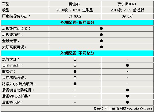外观方面,两款车都配备了全景天窗,十分符合主流消费需求。两款车都未配备氙气大灯和大灯清洗功能,而奥迪Q5可以选装这两项配置,XC60则不能。不过XC60配备了日间行车灯,而奥迪Q5这一标志性的产物却只能选配。