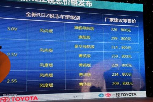 此次国产新一代丰田锐志推出了2.5L、3.0L两种排量共计7款车型。其中2.5L排量的车型包括:2.5S风度菁华版、2.5S风尚菁华版、2.5V风度菁英版、2.5V风尚菁英版、2.5V风尚豪华导航版;3.0L排量的包括:3.0V风尚旗舰版、3.0V风尚旗舰导航版。