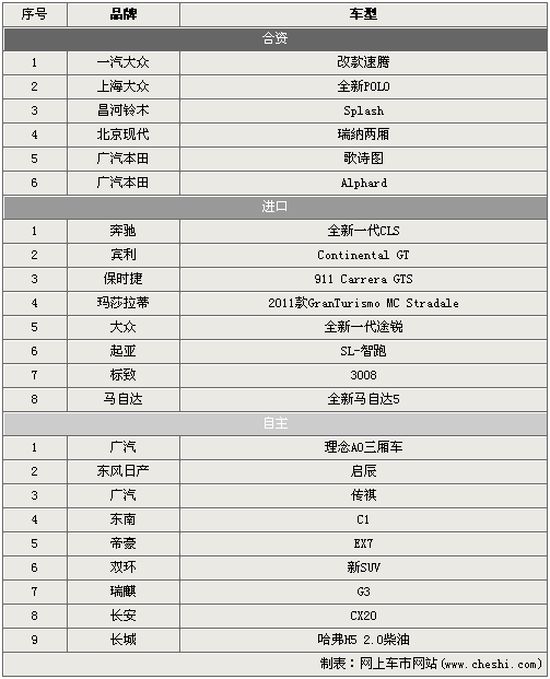 从表中可以看出,在2010年第四季度(10-12月)共有23款新车将于消费者见面。合资品牌品牌共有6款车型登场,上海大众的全新POLO和广汽本田的歌诗图是关注度相对高的两款明星车型;进口阵营中奔驰全新CLS已经被炒得非常火热,而售价低很多的起亚SL-智跑则会引起共多SUV爱好者的注目;自主帮派以9款新车雄居榜首,第四季度这部分的特点在于有全新的品牌加入战局,广汽、东风等合资品牌都将下一步的计划投身到自主品牌的浪潮之中。