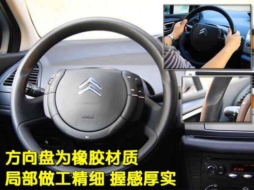 东风雪铁龙2011款世嘉三厢的橡胶方向盘手握感觉很好,三厢世嘉采用了中央集控方向盘设计,音响、定速巡航与蓝牙免提等操控装置集中在方向盘中央。
