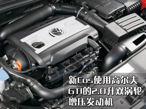 动力上2011款Eos搭载第六代高尔夫GTI的2.0升双涡轮增压发动机,最高输出功率155千瓦,峰值扭矩280牛米,百公里加速仅7.8秒。用户可以选择6速手动变速箱或DSG双离合自动变速箱。另外,还有一款2.0升柴油发动机可供选择,最高输出功率103千瓦。