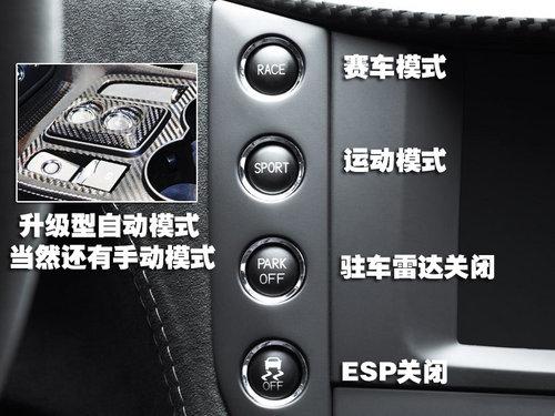 状态切换去的按钮,依次是赛车模式的RACE按钮,运动模式的SPORT按钮,还有驻车雷达的开关和车身动态稳定系统的开关。而中央扶手区前,最具驾驶乐趣的手动驾驶模式和升级后的自动驾驶模式则被安置在了最显眼的位置。