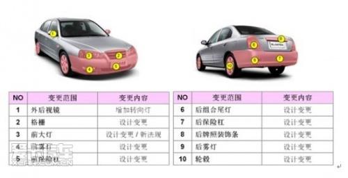 2011款伊兰特的改变主要体现在外观上,包括对前格栅、前雾灯、后雾灯、前保险杠、后保险杠、后组合尾灯、后牌照装饰条、轮毂等进行了设计变更,外形更加时尚、简洁。