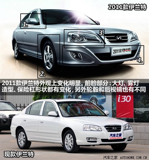 本次改款以外观改进升级为主,包括:对前格栅、前/后雾灯、前/后保险杠、后组合尾灯、后牌照装饰条、轮毂等进行了设计变更。同时还对前大灯进行了设计变更,使之更符合现在的新法规。另外,2011款伊兰特在外后视镜上增加了转向灯。
