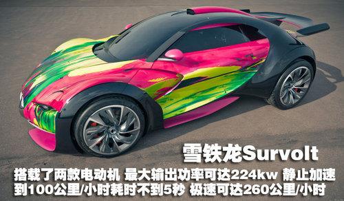 雪铁龙Survolt概念车是一款十足的电动车,搭载了两款电动机,动力由两部31千瓦时锂离子电池组提供,其最大输出功率可达224kw,这款车从静止加速到100公里/小时所需时间不到5秒,最高时速可达260公里/小时,这款车续航里程可达200公里。当电池组电量耗尽时,可选择使用快速充电器来充电,只需两个小时,也可以用220V家用电来充电,需10个小时充满。