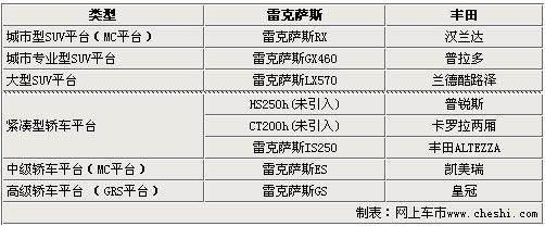 说起汽车的平台技术,人们首先就会想到大众著名的PQ35平台,国内热销的速腾、途安、明锐、高尔夫6、途观和奥迪TT等车型均衍生自这个平台。优秀平台技术之间的共用关系不仅有利于汽车市场的发展,而且还可以有效的为公司降低成本。而在共用平台方面,日本汽车巨头-丰田则也有自己的独门秘籍,并且成功的应用在旗下豪华品牌——雷克萨斯身上。下面就让我们一起来了解一下雷克萨斯与丰田享用同一平台的16款车型。
