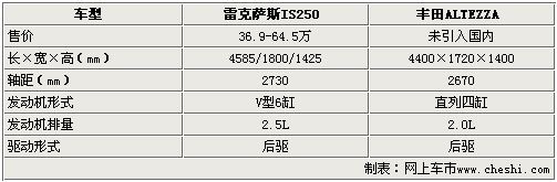 IS系列车型与ALTEZZA 均属于入门级运动车型,在车身尺寸方面,雷克萨斯IS系列要明显的优于ALTEZZA,在轴距方面也具有不小的优势。上市不久的IS250车型采用了V型6缸发动机和后轮驱动,保证了这跨车的运动性能。由于ALTEZZA未向国内引入,所以这两款同平台车型的差价无法比较。