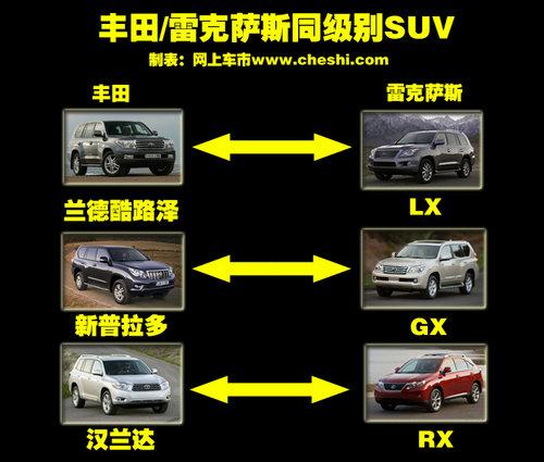 丰田汽车对SUV车型的细分十分的到位,目前在国内销售的车型包括RAV4、汉兰达、FJ酷路泽、新普拉多和兰德酷路泽等车型,囊括了各个细分市场。而雷克萨斯引入国内的车型则包括了RX、GX(公布售价但未正是上市)和LX等车型。